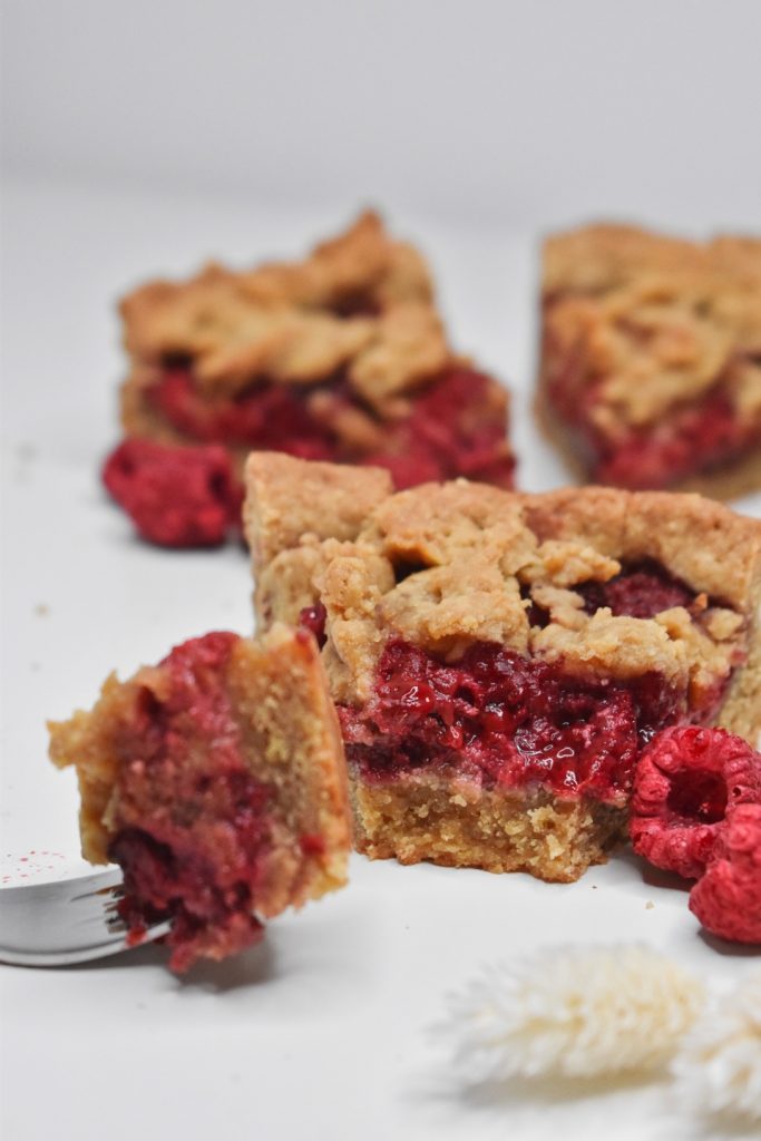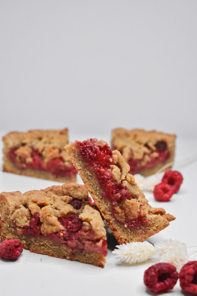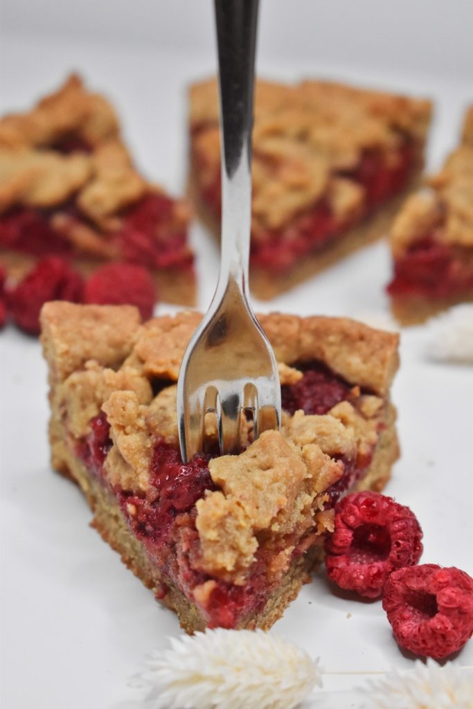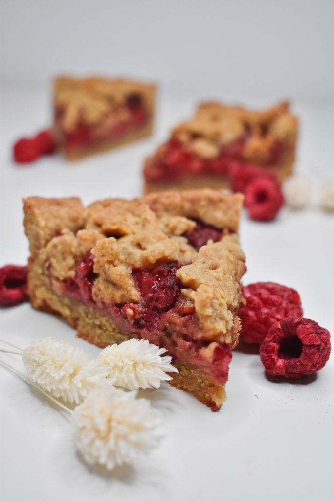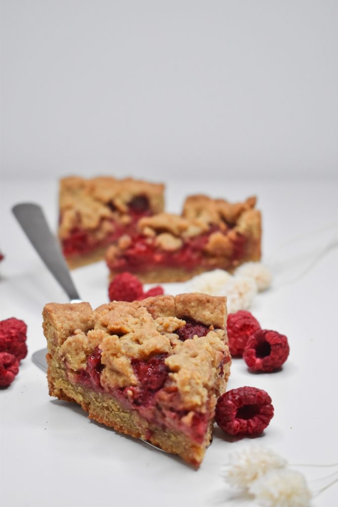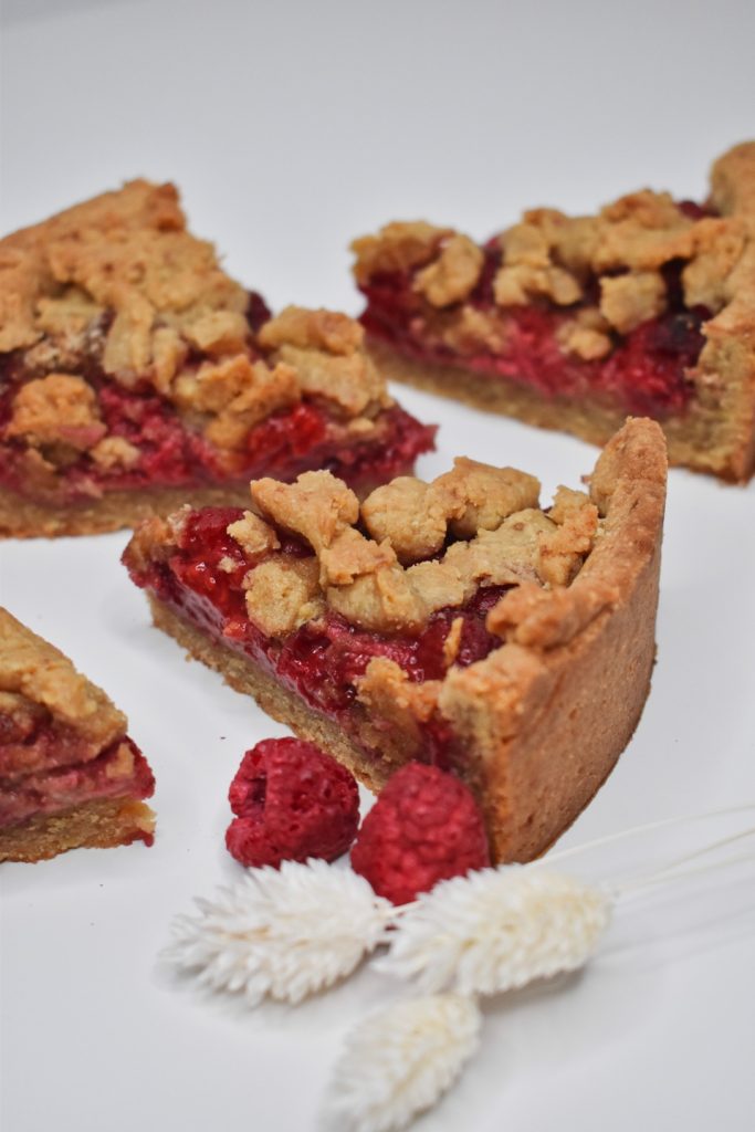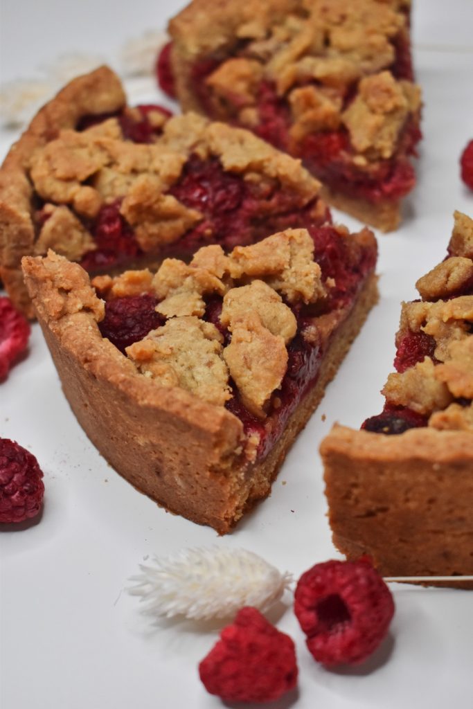 – Maline, mandljevo moko in kokosov sladkor dobro zmešamo in enakomerno razporedimo po testu.